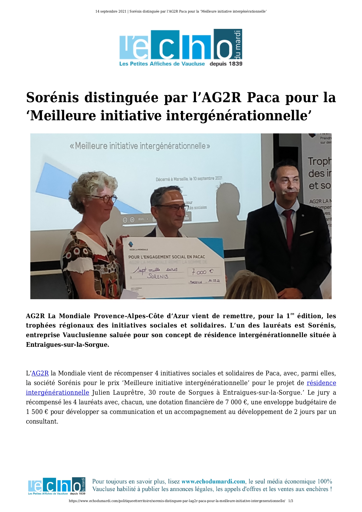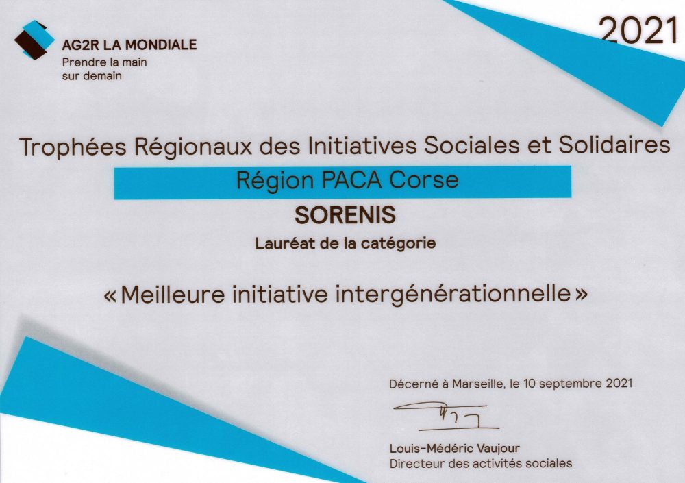 Sorenis, lauréat régional de la meilleure initiative intergénérationnelle 2020-2021 PACA-CORSE par l’AG2R La Mondiale